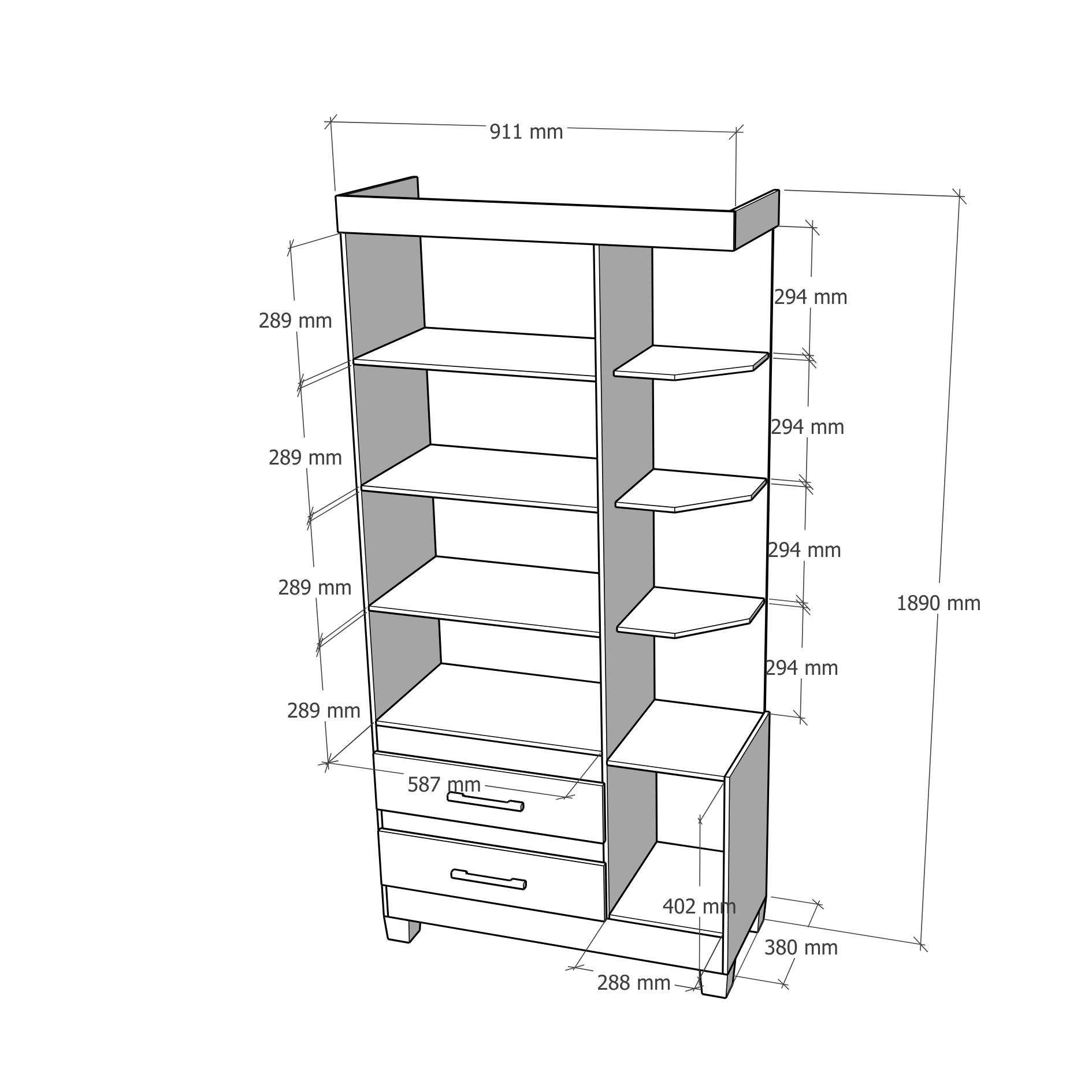 Con tres puertas, una esquinera, repisas y cajones. Ideal para espacios pequeños y fácil de limpiar.